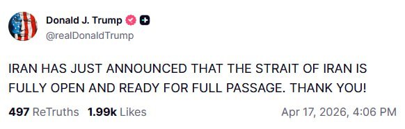 وقال ترامب في تغريدة له على تروث سوشيال “أعلنت إيران للتو أن مضيق إيران مفتوح بالكامل وجاهز للمرور الكامل. شكرًا لكم!”