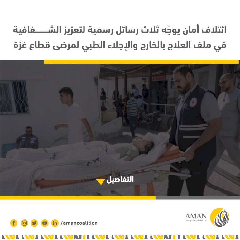 وجّه الائتلاف من أجل النزاهة والمساءلة (أمان) ثلاث رسائل رسمية إلى جهات صحية محلية ودولية، دعا فيها إلى تعزيز مبادئ الشفافية والإفصاح في إدارة ملف التحويلات الطبية والإجلاء الطبي لمرضى قطاع غزة، في ظل التحديات غير المسبوقة التي يشهدها القطاع نتيجة الحرب والأوضاع الإنسانية المتفاقمة.