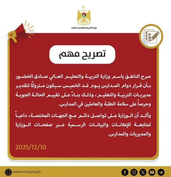 أصدرت وزارة التربية والتعليم العالي، مساء اليوم الأربعاء، بيانا بشأن دوام المدارس ليوم غد الخميس.
