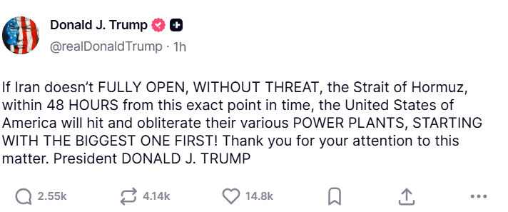 هدد الرئيس الأمريكي ترمب اليوم الأحد، بضرب جميع محطات الطاقة في إيران إذا لم تفتح مضيق هرمز خلال الـ48 ساعة القادمة وبدون تشكيل أي تهديد.