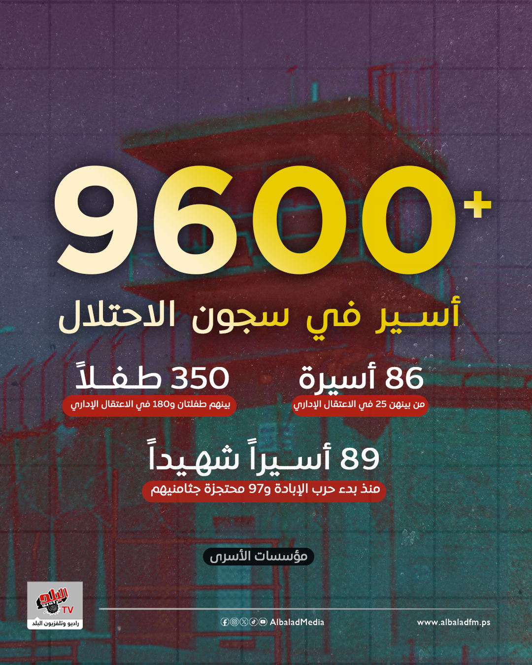 أفادت هيئة شؤون الأسرى والمحررين بأن إجمالي عدد الأسرى الفلسطينيين والعرب في سجون الاحتلال حتى بداية نيسان/ إبريل 2026 بلغ أكثر من 9600.