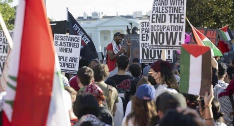 وأظهرت لقطات إعلامية محتجين يقفون خارج البيت الأبيض ويحملون لافتات كتب عليها “يجب أن تكون السلطة بيد العمال” و”لا للملكية” و”أوقفوا تسليح إسرائيل”.