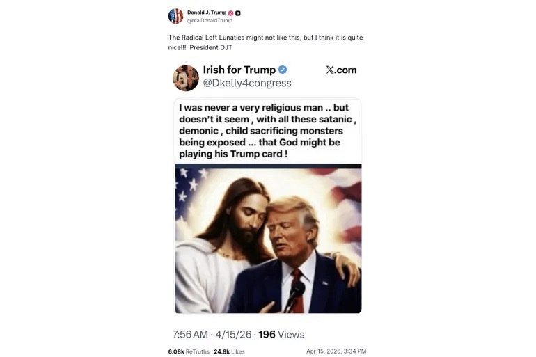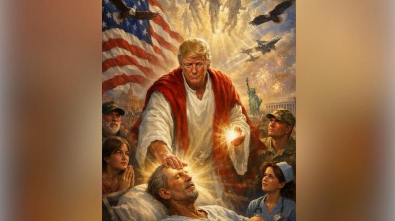 وتُظهر الصورة -التي أعاد ترمب نشرها على حسابه بمنصته “تروث سوشال”- ترمب وعيناه مغمضتان، ويلامس جبينه جبين “السيد المسيح” وهو يقف في وضع مشابه. وفي الخلفية علم أمريكي. وترافق المنشور الأصلي مع تعليق تضمن عبارة “ربما يستخدم الرب ورقته الرابحة!”.