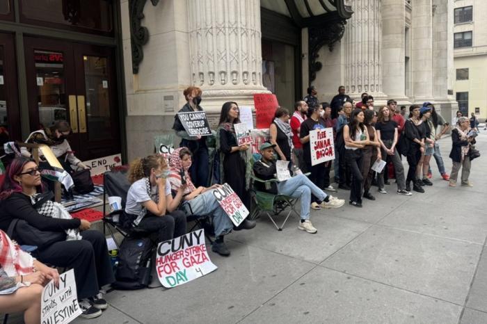 يواصل طلبة وأكاديميون في مركز الدراسات العليا التابع لجامعة مدينة نيويورك (CUNY)، إضرابهم عن الطعام لليوم الرابع على التوالي، للمطالبة بوقف جرائم الإبادة الجماعية التي تُرتكب بحق الفلسطينيين في قطاع غزة.