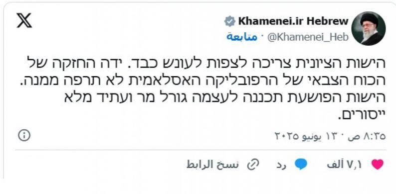 نشر المرشد الإيراني علي خامنئي منشورا على منصة “إكس” باللغة العبرية، وجه فيه تهديدا إلى الاحتلال في أعقاب العدوان الذي شنته فجر اليوم الجمعة، والذي أدى إلى استشهاد مسؤولين إيرانيين.