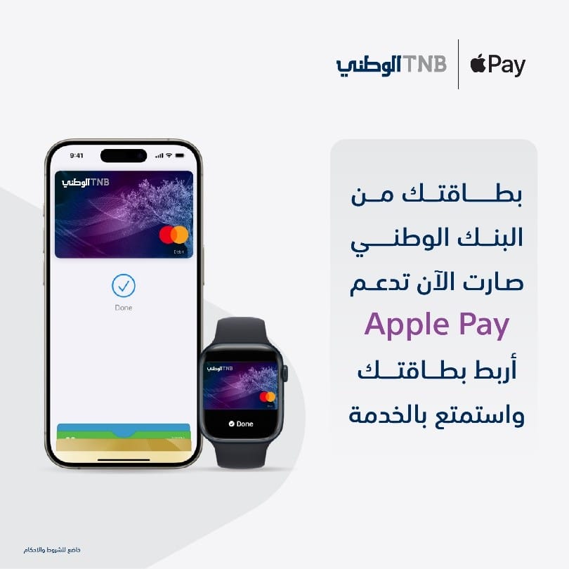 انطلاقا من التزامه المستمر بتوفير تجربة مصرفية متطورة لعملائه، أعلن البنك الوطني اليوم عن إطلاق خدمةApple Pay ، وهي أحد أحدث حلول الدفع الرقمية التي تتيح للعملاء إجراء عمليات الدفع بسهولة وبشكل عملي، وبأعلى معايير الأمان دون الحاجة لحمل البطاقة.