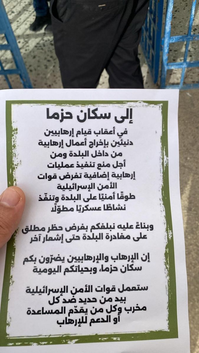 فرضت قوات الاحتلال الإسرائيلي حصارا على بلدة حزما شمال شرقي القدس المحتلة حتى إشعار آخر، بالتزامن مع توزيع منشورات تعلن عن فرض طوق أمني شامل على البلدة.