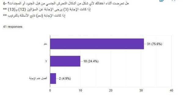 كما أفاد (60.6%) أنهم كانوا شهودًا على تحرش جنسي بحق أسرى آخرين، في حين أكد (39.4%) أنهم لم يشاهدوا شيئًا من هذا القبيل.