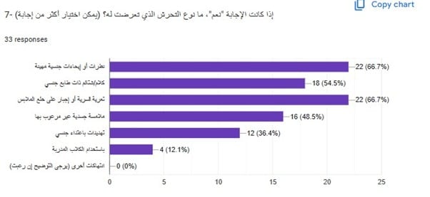 النتائج أظهرت تعرض (75.6%) منهم/ــن للتحرش الجنسي، فيما أكدت ما نسبته (24.4%) عدم حدوث شيء من هذا القبيل معهم، فيما آثرت ما نسبته (4.9%) عدم الإجابة.