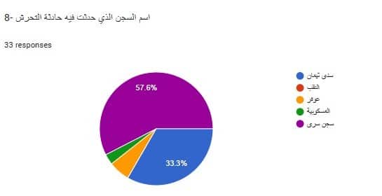 وفيما يتعلق بأماكن حدوث الانتهاكات، أشارت نسبة (57.6%) من المبحوثين، إلى أنهم كانوا في سجون سرية، بينما أكد (33.3%) حدوث الانتهاكات بحقهم في سجن “سدي تيمان”، بينما تعرضت ما نسبته (6.1%) للانتهاكات الجنسية في سجن عوفر، و(1.3%) في سجن المسكوبية.