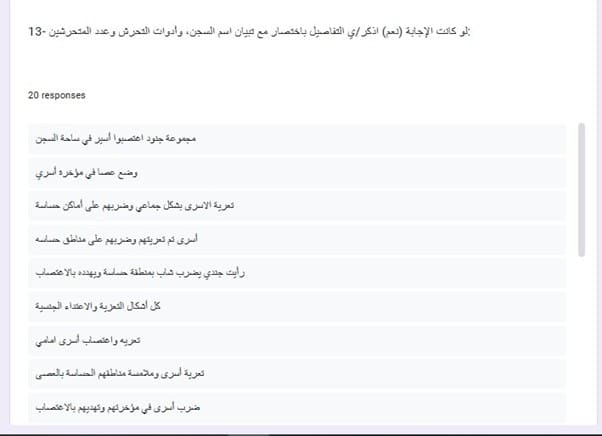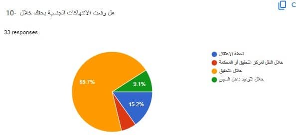 كما تعرض 69.7% للتحرش والانتهاكات خلال التحقيق، و15.2% خلال الاعتقال، و9.1% أثناء وجودهم داخل السجن، و6.1% خلال النقل إلى مركز التحقيق أو المحكمة.