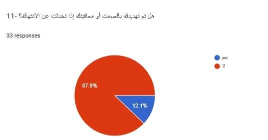 وأجابت ما نسبته (87.9%) من المتجاوبين مع أسئلة الاستبانة، أنهم لم يتعرضوا للتهديد بالصمت أو العقاب إن تحدثوا عن الانتهاكات، بينما تعرّض (12.1%) للتهديد حال الإفصاح عمّا جرى، وهذا إن دل على شيء فإنما يدل على ضرب حكومة الاحتلال وجنودها القوانين الدولية والإنسانية الخاصة بالأسرى بعرض الحائط.