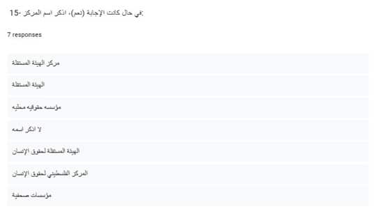 وأظهرت نتائج العينة، تقدم (25.9%) فقط بشكاوى رسمية إلى مراكز حقوقية حول تعرضهم لتحرش جنسي، شملت الهيئة المستقلة لحقوق الإنسان، والمركز الفلسطيني لحقوق الإنسان، ومؤسسات حقوقية لم يذكر اسمها.