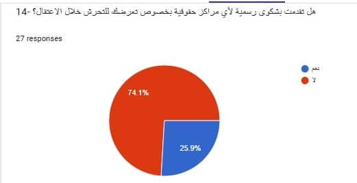في المقابل، لم تتقدم ما نسبته (74.1%) بأي شكوى، مرجعين ذلك إلى أنهم لم يلتقوا بأي مركز منذ الإفراج عنهم، إضافة إلى عدم عثورهم على أي مركز حقوقي.