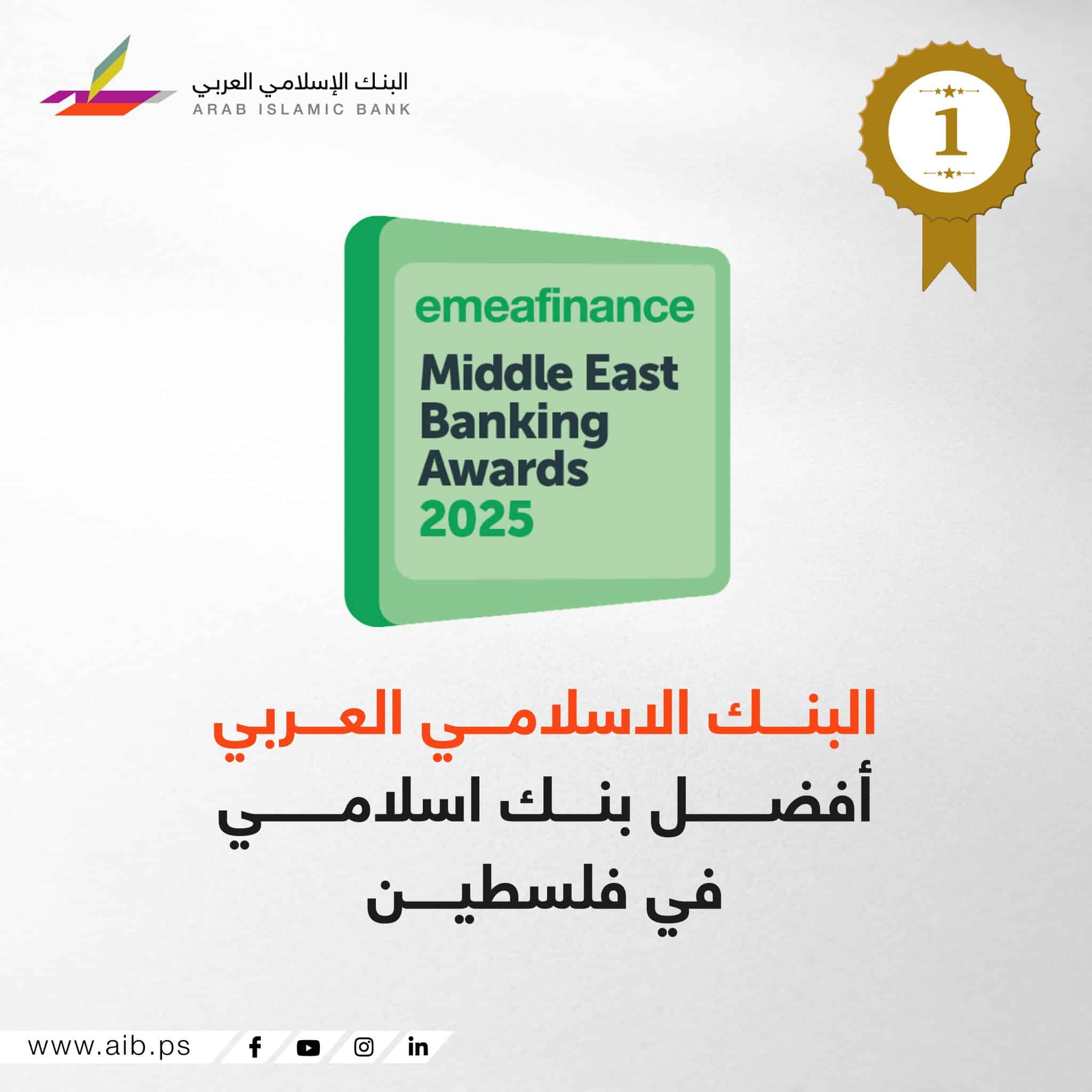 في إضافة جديدة إلى سجل إنجازاته وجوائزه الدولية، فاز البنك الإسلامي العربي بلقب “أفضل بنك إسلامي في فلسطين لعام 2025” من مجلة EMEA Finance، وذلك ضمن جوائز القطاع المصرفي في الشرق الأوسط لعام 2025، في نسختها الثامنة عشرة.