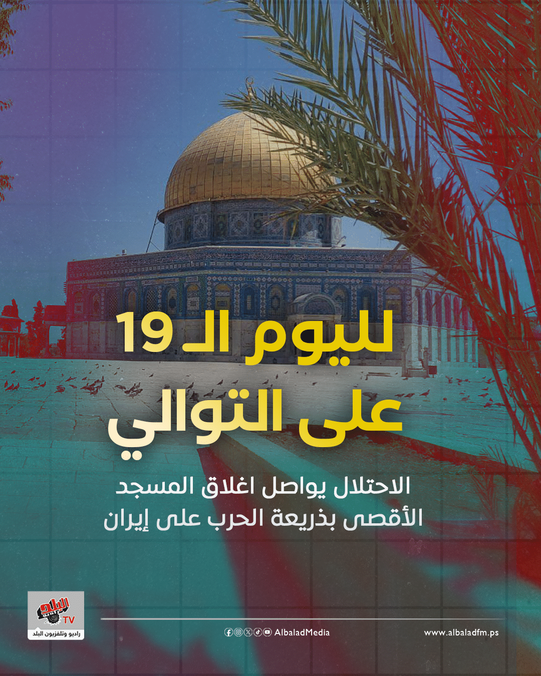 تواصل سلطات الاحتلال الإسرائيلي إغلاق المسجد الأقصى المبارك بمدينة القدس المحتلة، وتمنع المصلين من الوصول إليه، لليوم التاسع عشر على التوالي، بحجة الأوضاع الأمنية المرتبطة بالحرب الأميركية الإسرائيلية على إيران.